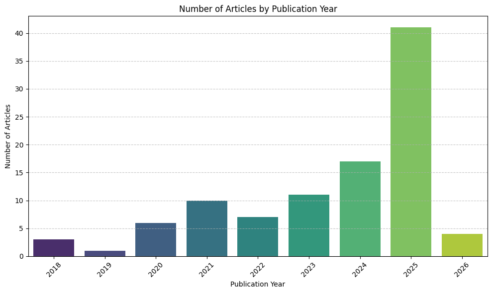 - Publication Years: The articles spanned from 2018 to 2026, with a notable concentration in recent years, particularly 2025 (41 articles) and 2024 (17 articles). This suggests a burgeoning interest and ongoing research in this area.